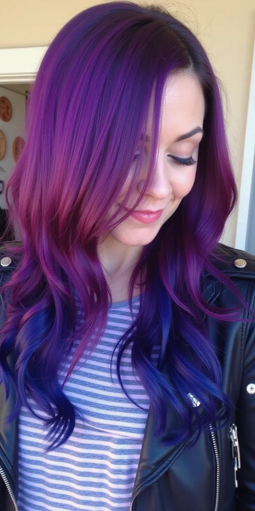 Purple to magenta ombre transforms long waves into a mesmerizing cascade of color that flows naturally with your hair’s movement.
