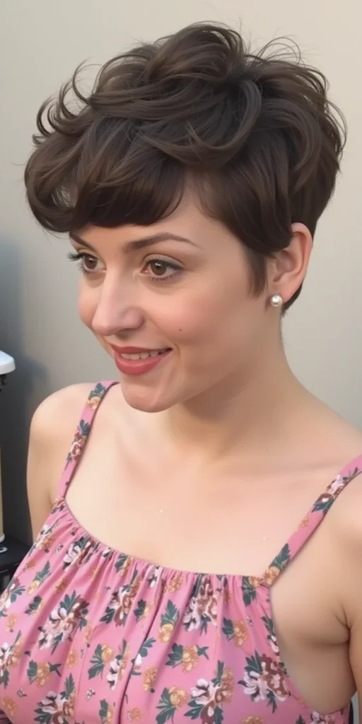 The layered pixie cut creates impressive volume for fine hair through strategic cutting techniques that add natural lift and body.