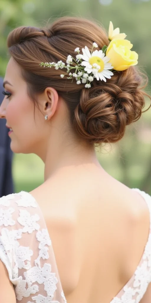 Loose, face-framing tendrils soften the shape and add a touch of romantic dimension. Seasonal blooms like baby’s breath, lavender, or small garden roses can be woven directly into the twist for a natural, elevated accent.